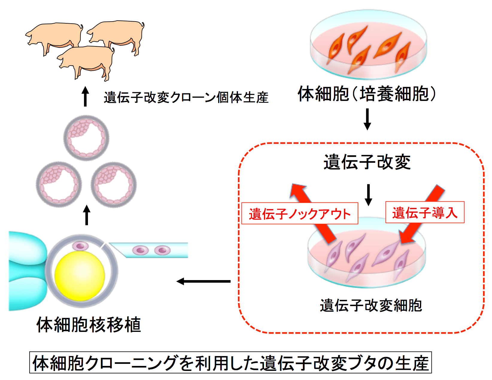 培養体細胞の核(2n)を、核を除去した卵細胞質内に移植して、クローン胚を作ります。移植された核の分化状態がリセット(初期化)され、クローン胚は受精卵と同様な発生を開始します。このようなクローン胚を借り腹雌に移植すると、クローン個体が生まれます。唾液腺幹細胞、前駆脂肪細胞など、ユニークな細胞から、世界で初めてクローンブタを生産した他、様々な遺伝子改変細胞からのクローンブタ生産に成功しています